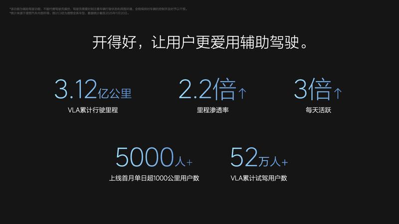 理想汽车表示VLA司机大模型的渗透率和活跃度远超之前的辅助驾驶。截止目前,理想VLA司机大模型行驶里程超过3.12亿公里,里程渗透率提高了2.2倍,日活提升了3倍,上线首月,VLA里程超1000公里的用户超过5000人,VLA累计试驾用户数超过52万人。