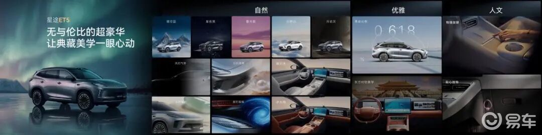 星途ET5一改星途此前的设计风格,采用新奢设计的自然恒韵美学设计语言,既有保时捷Macan的既视感,也有自己对时尚的独特理解。新车包括5种外观色和2种内饰色,为用户带来更多选择。外观设计思路结合了风的气势、玉的温润、贝的高贵、星的璀璨,其前脸标志性的“贝形大灯”与尾部由472颗LED灯珠组成的“星瀚灯带”,拥有极高的辨识度。
