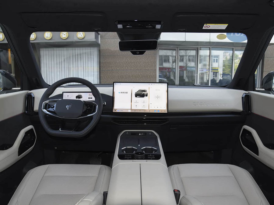 车内风格偏硬朗,有一定的设计感,两侧的空调出风口与尾灯造型形成了呼应。中控台层次清晰,中控屏尺寸为15.6英寸,拥有2.5k分辨率,车机系统则用到了8255芯片,配备越野360全景系统以及智能旅行路书等功能。在交互逻辑上,智趣烈马系统界面布局清晰合理,关键信息一目了然。其行业首创的自定义智能旋钮,自带全彩IPS显示屏,支持音量、温度、驾驶模式、座椅功能等数多种功能的自由定义。用户通过旋转、按压两个简单动作,即可完成大部分高频操作。而诸如70英寸AR-HUD抬头显示、全液晶仪表、手机无线充电、语音AI大模型、21扬声器音响系统、7.5L冷暖车载冰箱、全景天窗等配置均有提供。