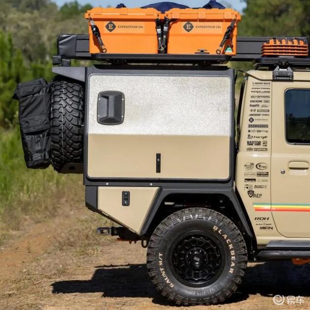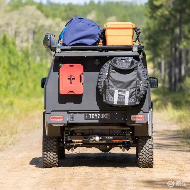 一眼望去,Toyzuki已脱胎换骨。它摒弃了吉姆尼原本短小精悍的轮廓,通过大幅修改车身面板,复刻了LC79系列标志性的方正、修长且充满力量感的车身比例,机盖的隆起设计也是致敬了LC79。后舱被隔断成为了皮卡结构,并且改造成为装备区,满足长途越野露营装备装载的需求,体现了为远征而生的理念。