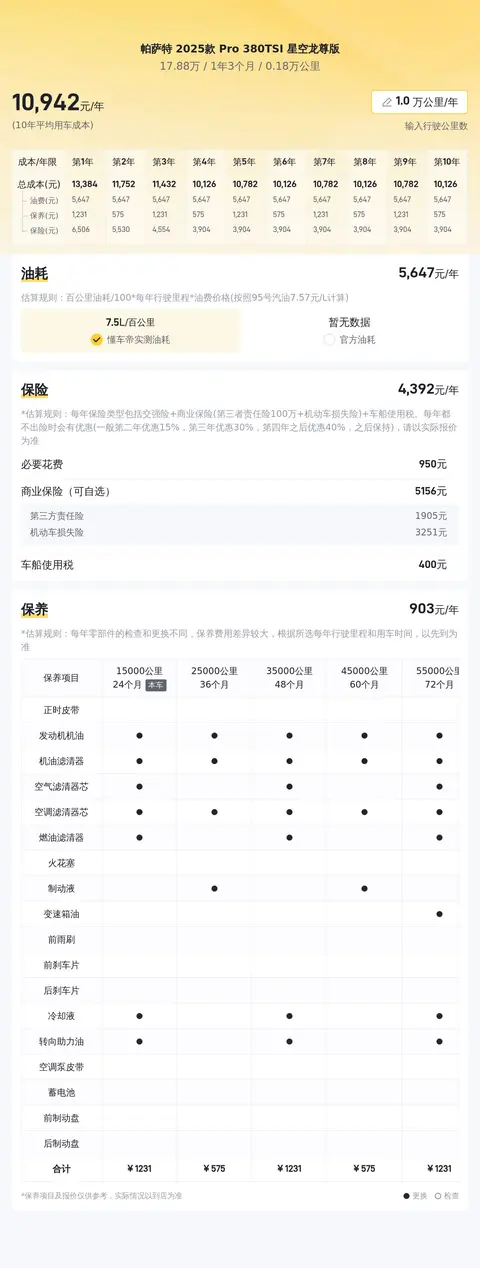 这辆帕萨特 2025款 Pro 380TSI 星空龙尊版的10年平均用车成本是11467元/年,而同级车最低是10438元/年,最高是13431元/年,相比之下,它的用车成本不算低。