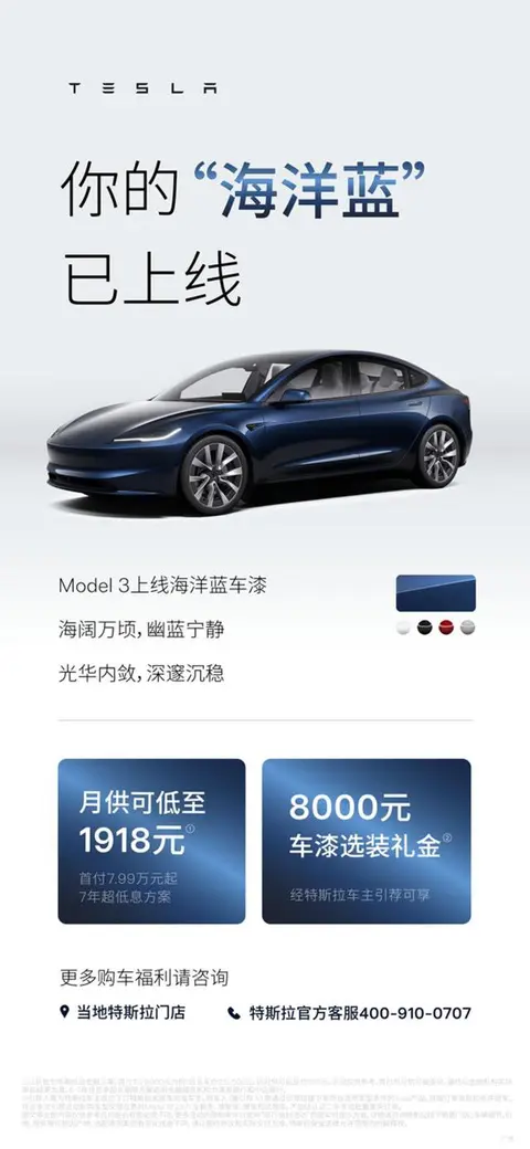Model 3也没闲着,换上了一身“新衣服”。“海洋蓝”车漆横空出世,这可不是以前那个蓝,看着更加沉稳深邃。里面加了特殊的珠光粉,光线一照,多重反射干涉,珍珠般的光泽流转,角度不同,风景各异。正所谓“士别三日,当刮目相看”,这颜值提升,绝对是回头率收割机。