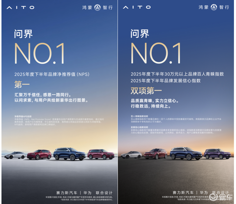 在用户规模快速增长的同时,问界始终保持着极高的用户满意度。在2024年下半年和2025年下半年,问界两次获得品牌NPS(净推荐值)第一,充分证明了其打造极致用户体验的标杆能力,树立了高端出行价值新标杆。