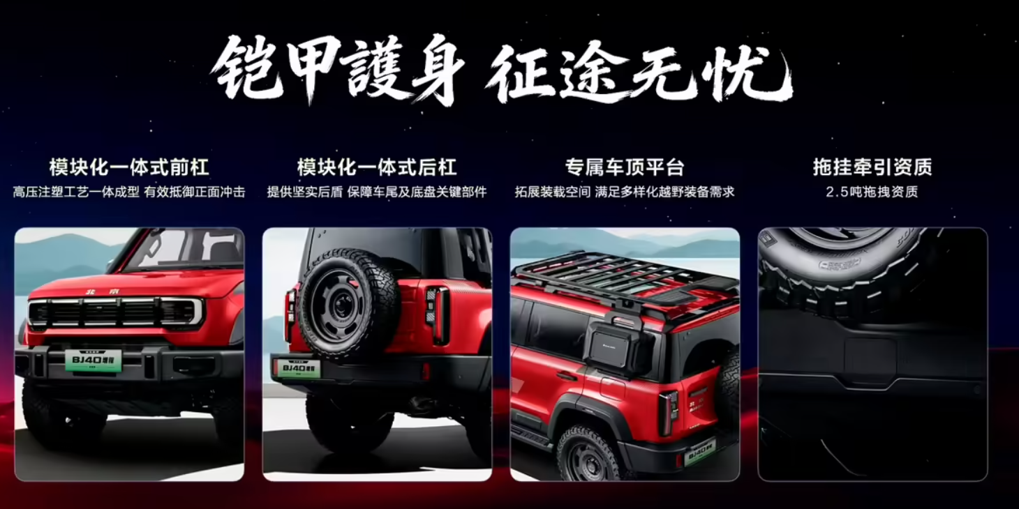 车型亮点方面,不同版本的分工很清晰。增程赤兔版走的是原厂改装越野路线,外观有专属的火焰红车漆和赤兔主题拉花,一眼就能认出。越野配置给得很足,高进气涉水喉、氮气减振器、全地形轮胎这些硬核装备都配齐了,还有一体式前后保险杠和内嵌式防滚架,甚至自带原厂拖挂资质,玩越野的话基本不用再额外折腾。