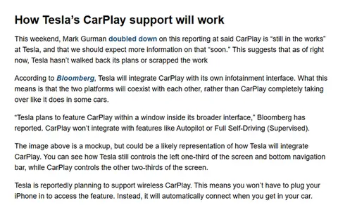 据科技记者马克·古尔曼(Mark Gurman)确认,特斯拉的CarPlay开发仍处于进行阶段,相关细节有望近期公布。这意味着特斯拉尚未改变计划或终止研发。彭博社进一步透露,特斯拉不会采用传统车企“全屏替换”的集成方式,而是将CarPlay嵌入现有信息娱乐系统的特定窗口中。根据曝光的界面模拟图,特斯拉将保留左侧三分之一屏幕及底部导航栏的控制权,剩余区域交由CarPlay显示苹果地图、媒体播放等内容,形成“双系统并行”的独特布局。