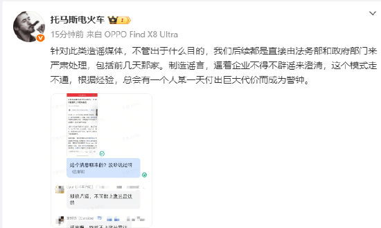 对此,小鹏汽车副总裁“托马斯电火车”发微博辟谣:针对此类造谣媒体,不管出于什么目的,我们后续都是直接由法务部和政府部门来严肃处理,包括前几天那家。制造谣言,逼着企业不得不辟谣来澄清,这个模式走不通,根据经验,总会有一个人某一天付出巨大代价而成为警钟。