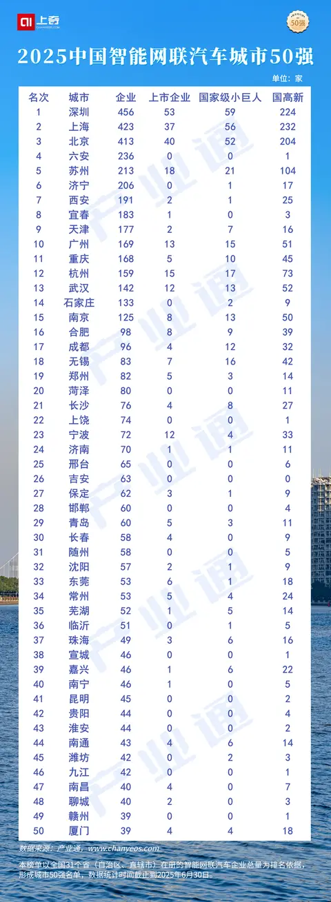 本文将以智能网联汽车产业为研究对象,从产业图谱、产业总览、创新活力、股权融资四个方面展开分析,并据此形成智能网联汽车产业城市50强。产业通数据显示,截止到2025年06月,全国智能网联汽车8523家,深圳、上海、北京是智能网联汽车企业数量最多的前三城市。